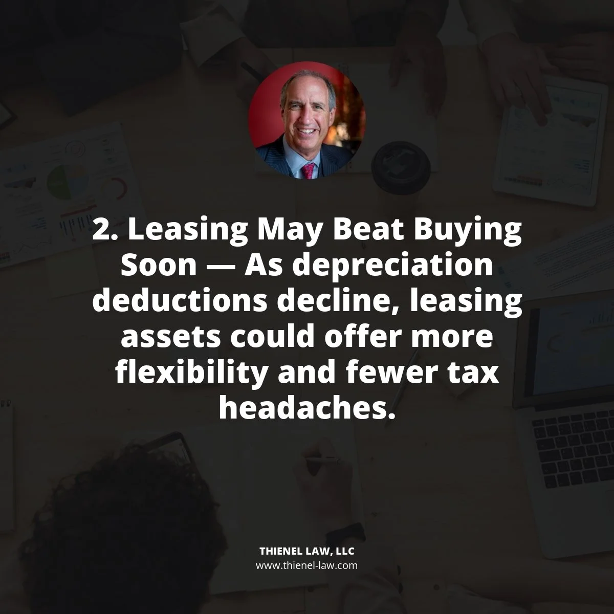 With bonus depreciation phasing out, leasing assets may start to look more attractive than purchasing—especially if the tax deduction associated with capital purchases becomes less significant. But it depends on the nature of the lease and the length of time you plan to hold or use the asset.